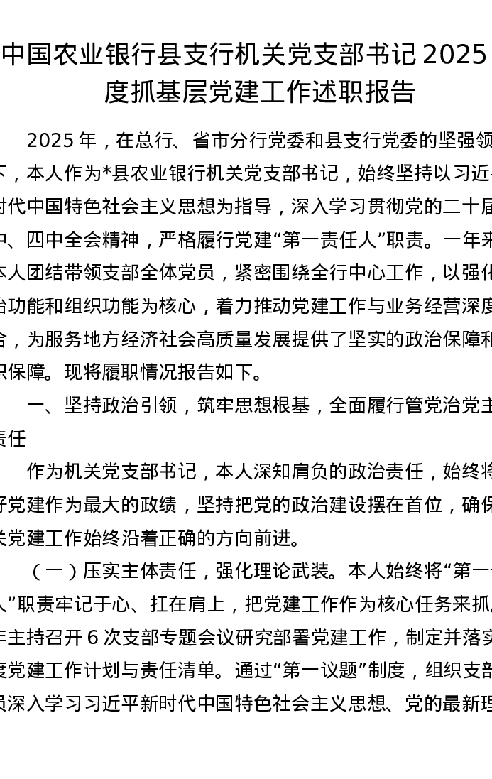 中国农业银行县支行机关党支部书记2025年度抓基层党建工作述职报告