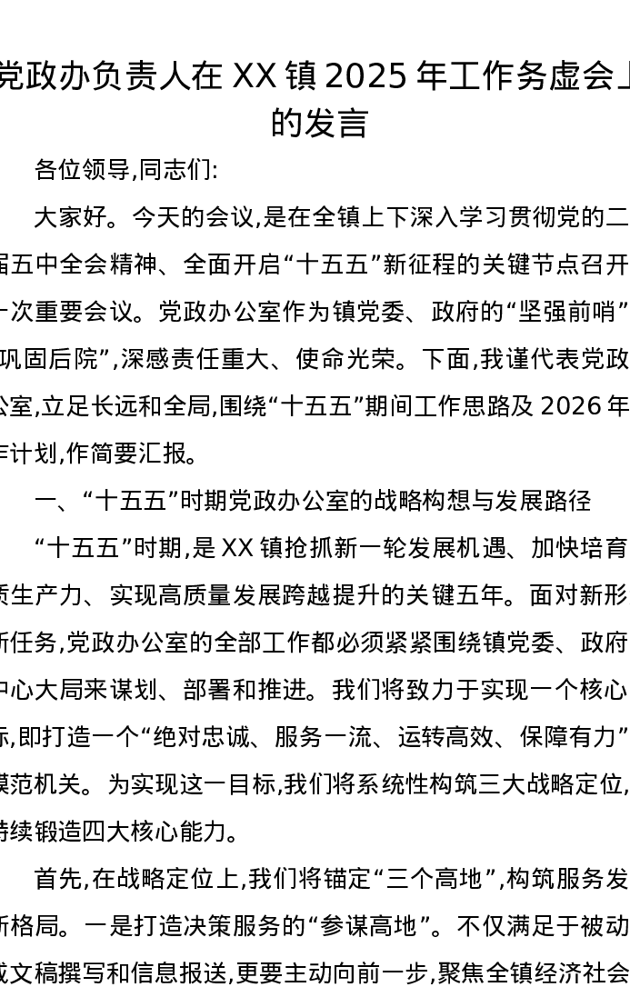党政办负责人在XX镇2025年工作务虚会上的发言