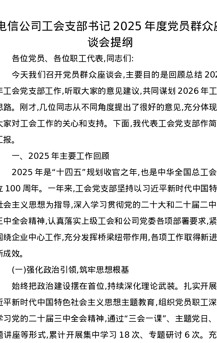电信公司工会支部书记2025年度党员群众座谈会提纲
