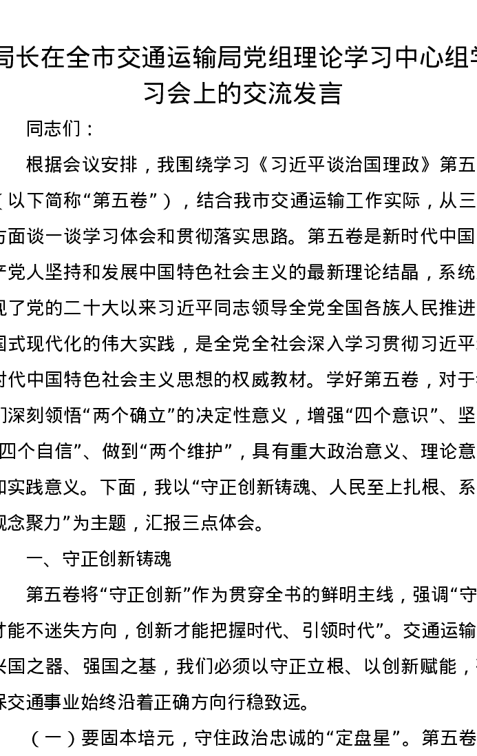 局长在全市交通运输局党组理论学习中心组学习会上的交流发言