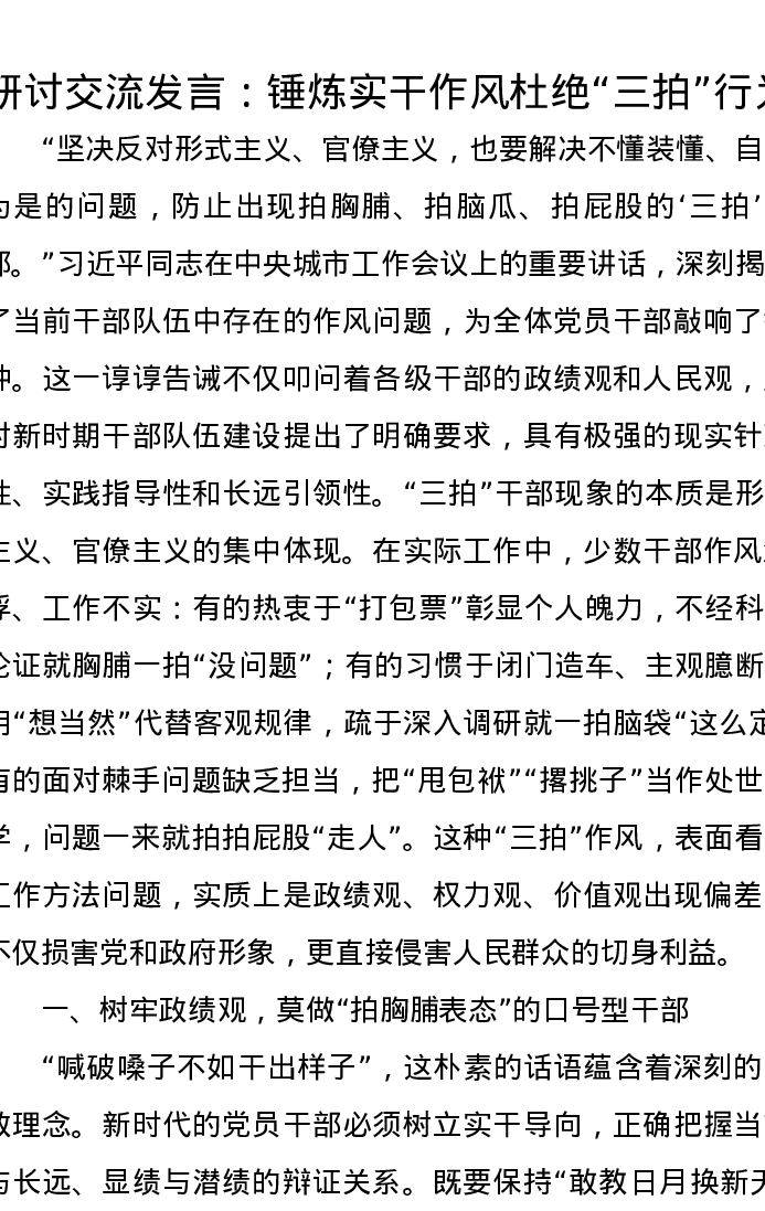 研讨交流发言:锤炼实干作风 杜绝“三拍”行为
