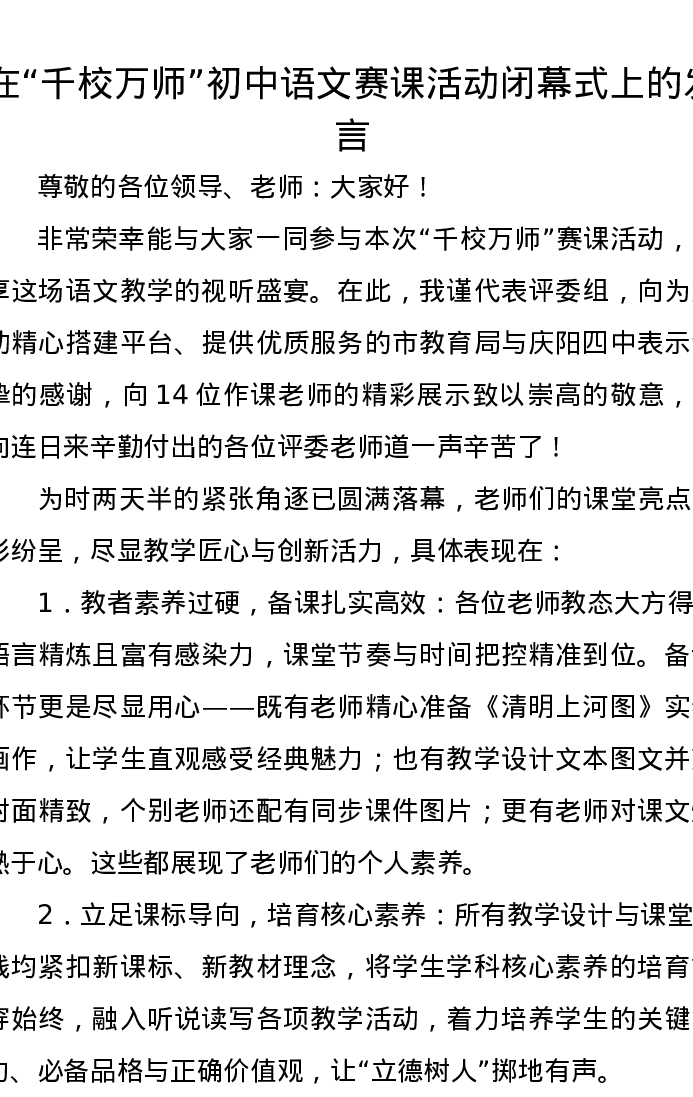 在“千校万师”初中语文赛课活动闭幕式上的发言
