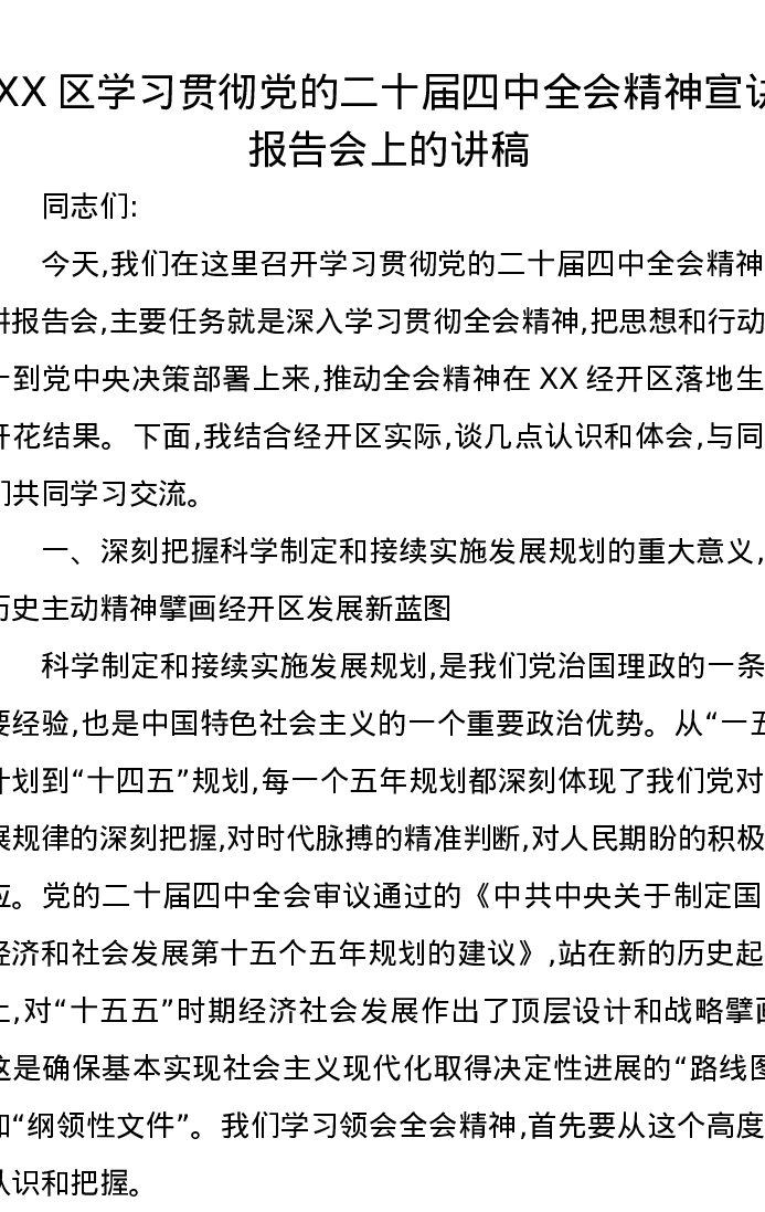 XX区学习贯彻党的二十届四中全会精神宣讲报告会上的讲稿