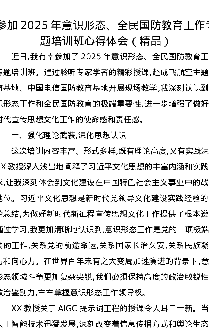 参加2025年意识形态、全民国防教育工作专题培训班心得体会(精品)