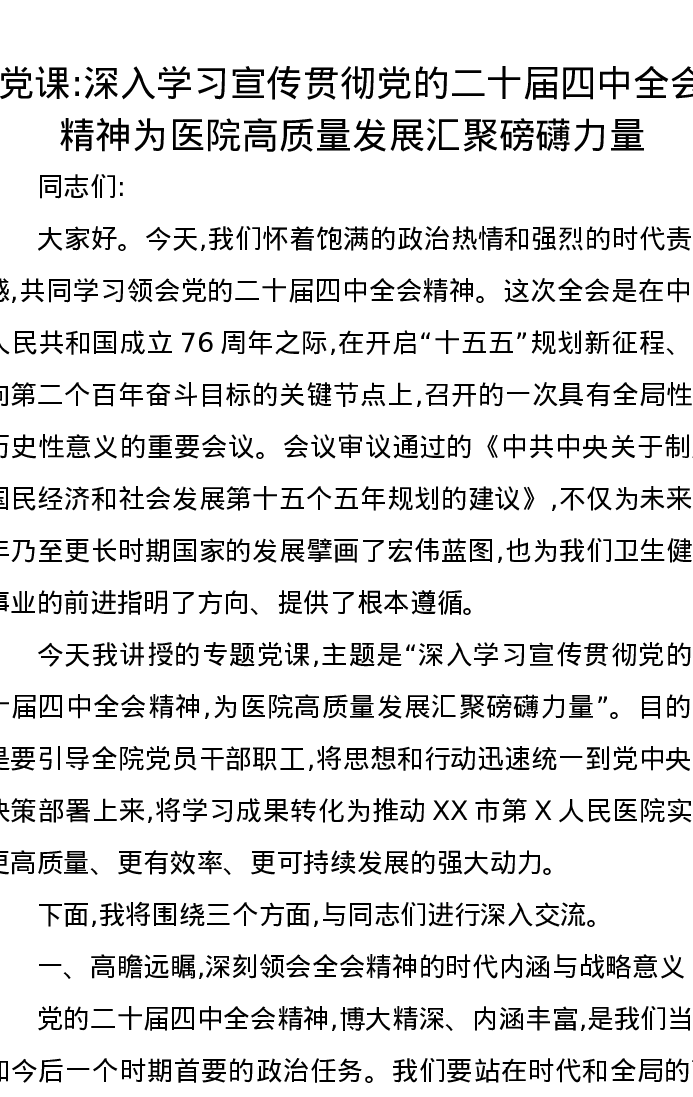 党课讲稿:深入学习宣传贯彻党的二十届四中全会精神为医院高质量发展汇聚磅礴力量