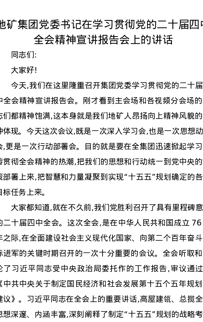 地矿集团党委书记在学习贯彻党的二十届四中全会精神宣讲报告会上的讲话