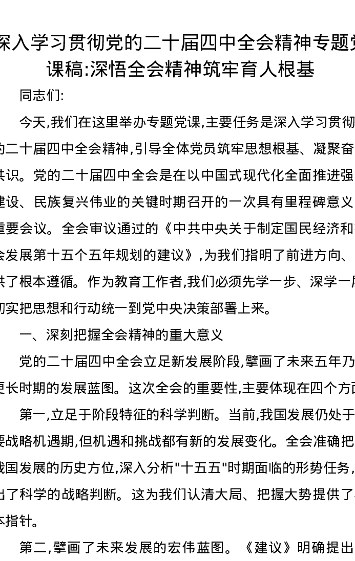 深入学习贯彻党的二十届四中全会精神专题党课稿:深悟全会精神筑牢育人根基
