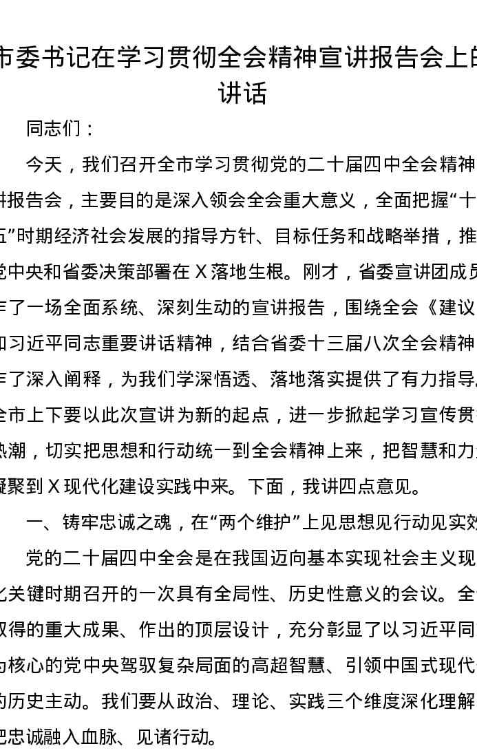 市委书记在学习贯彻二十届四中全会精神宣讲报告会上的讲话