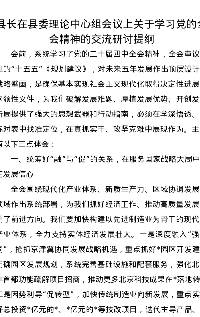 县长在县委理论中心组会议上关于学习党的二十届四中全会精神的交流研讨发言提纲