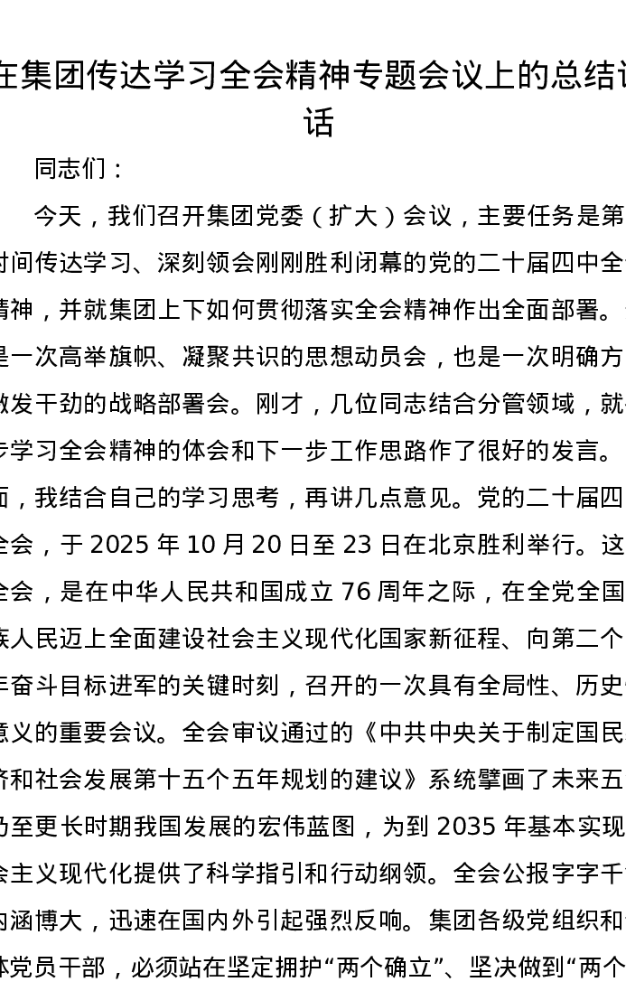 在集团传达学习二十届四中全会精神专题会议上的总结讲话
