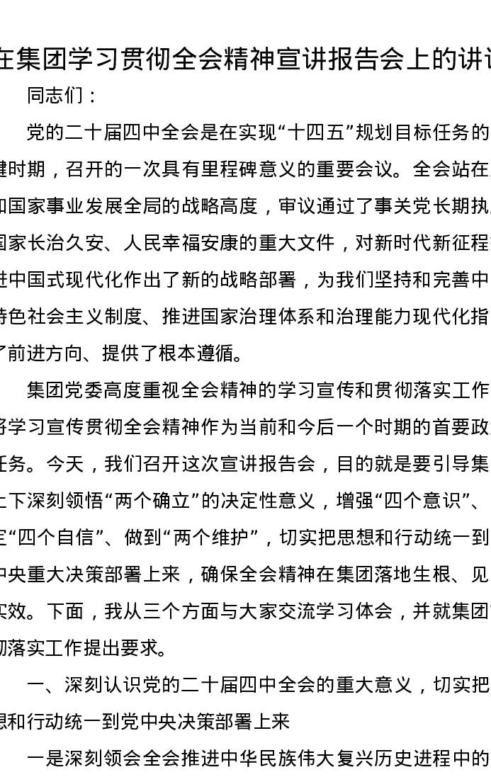 在集团学习贯彻二十届四中全会精神宣讲报告会上的讲话