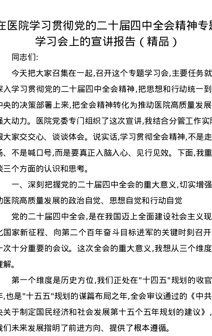 在医院学习贯彻党的二十届四中全会精神专题学习会上的宣讲报告(精品)