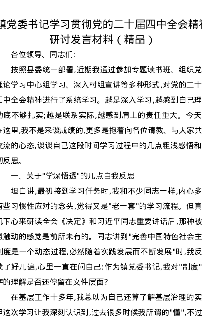 镇党委书记学习贯彻党的二十届四中全会精神研讨发言材料(精品)