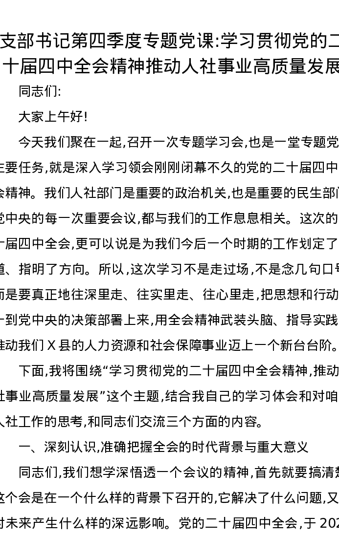 支部书记第四季度专题党课学习贯彻党的二十届四中全会精神 推动人社事业高质量发展