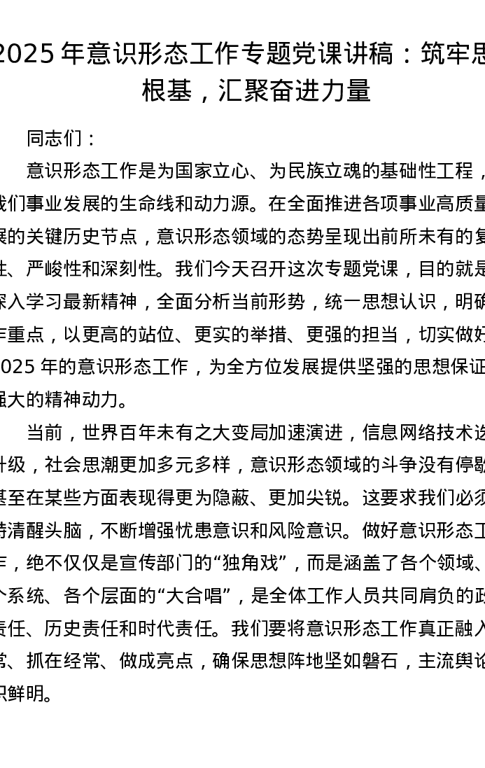 2025年意识形态工作专题党课讲稿:筑牢思想根基,汇聚奋进力量
