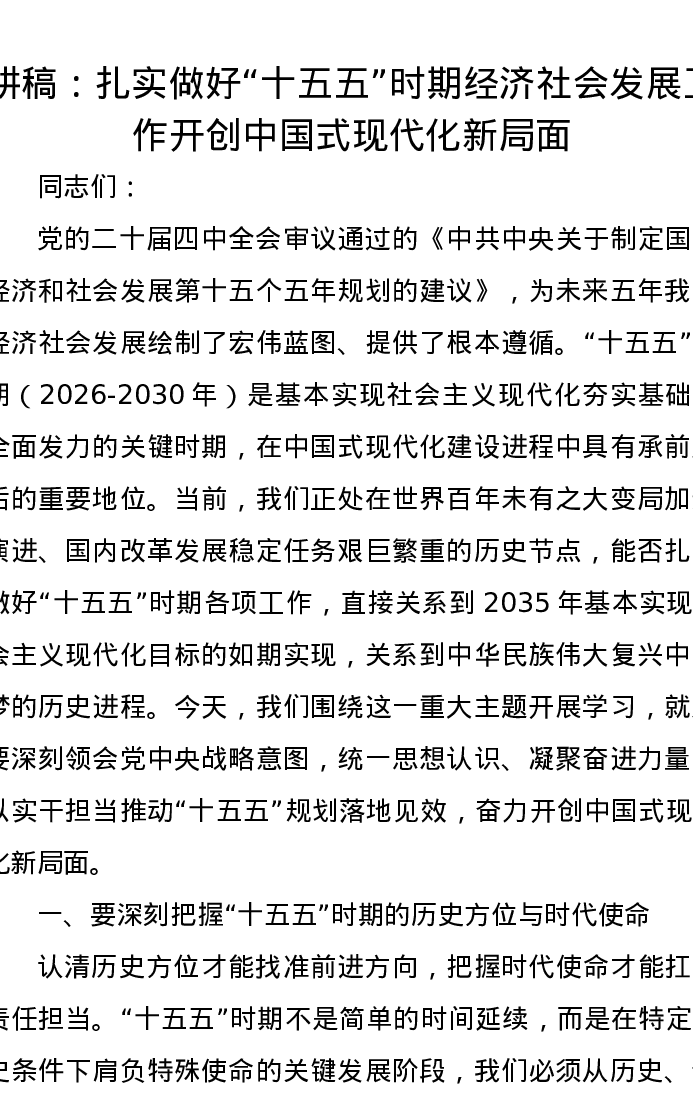 讲稿:扎实做好“十五五”时期经济社会发展工作 开创中国式现代化新局面