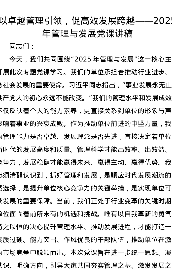 以卓越管理引领,促高效发展跨越——2025年管理与发展党课讲稿