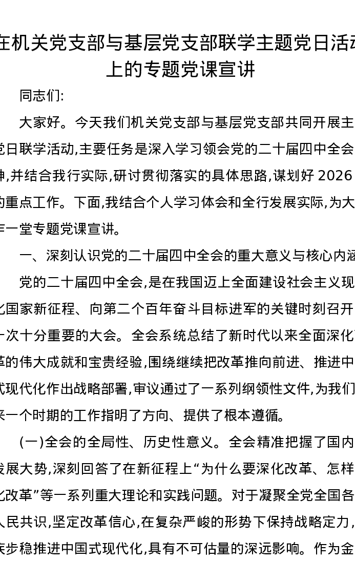在机关党支部与基层党支部联学主题党日活动上的专题党课宣讲