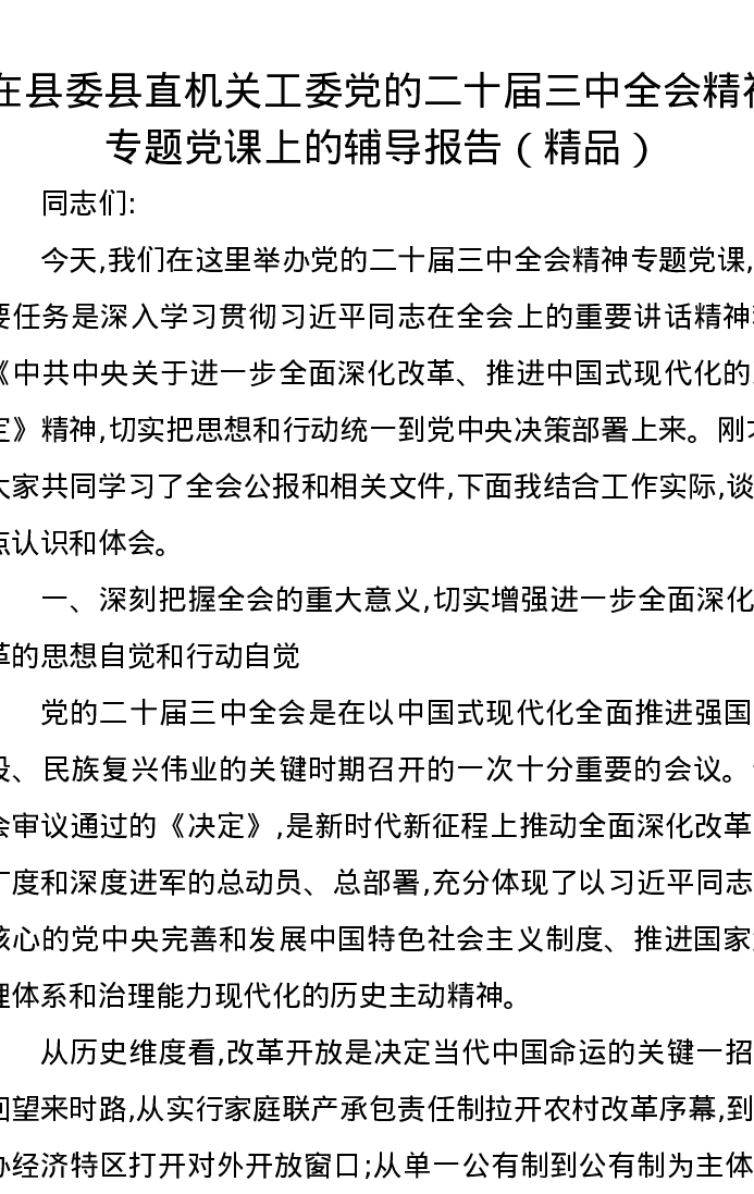 在县委县直机关工委党的二十届三中全会精神专题党课上的辅导报告