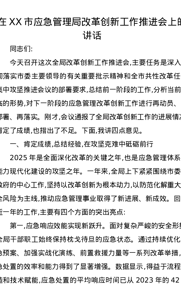 在XX市应急管理局改革创新工作推进会上的讲话