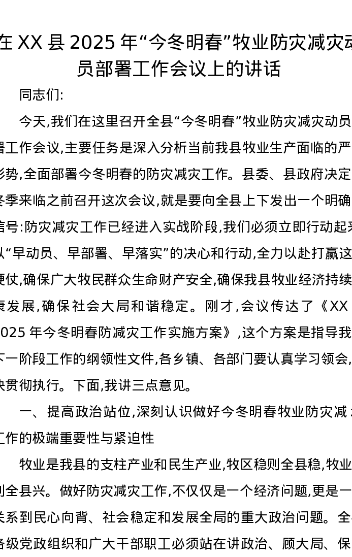 在XX县2025年“今冬明春”牧业防灾减灾动员部署工作会议上的讲话