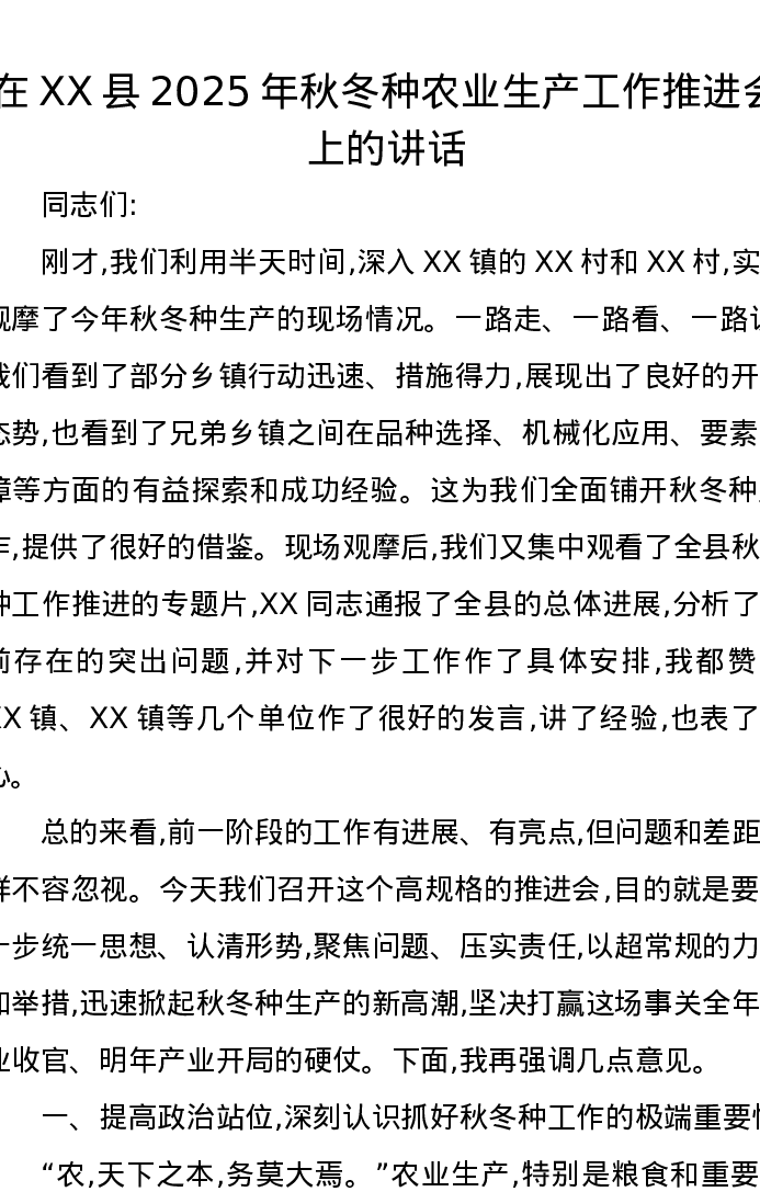 在XX县2025年秋冬种农业生产工作推进会上的讲话