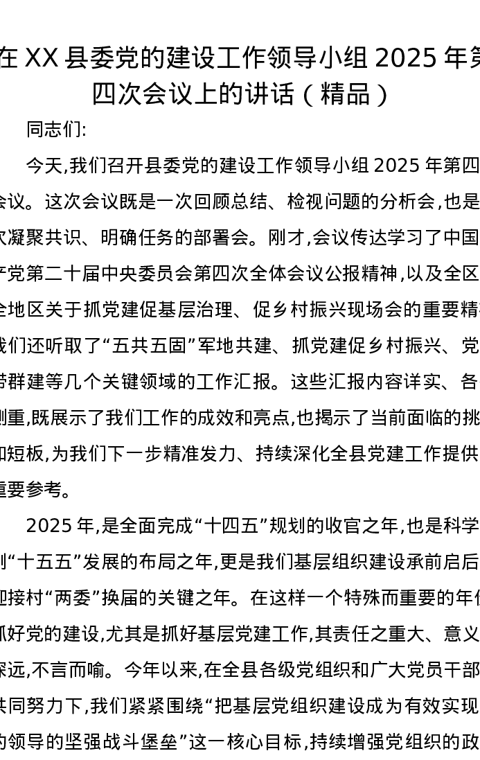 在XX县委党的建设工作领导小组2025年第四次会议上的讲话(精品)