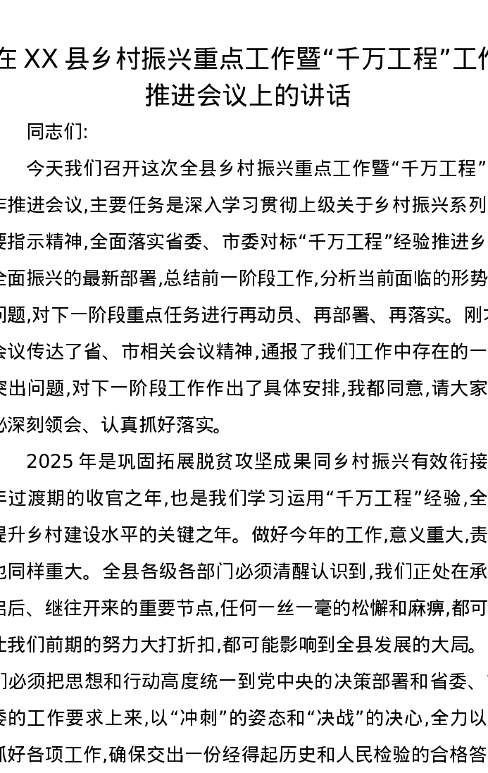 在XX县乡村振兴重点工作暨“千万工程”工作推进会议上的讲话