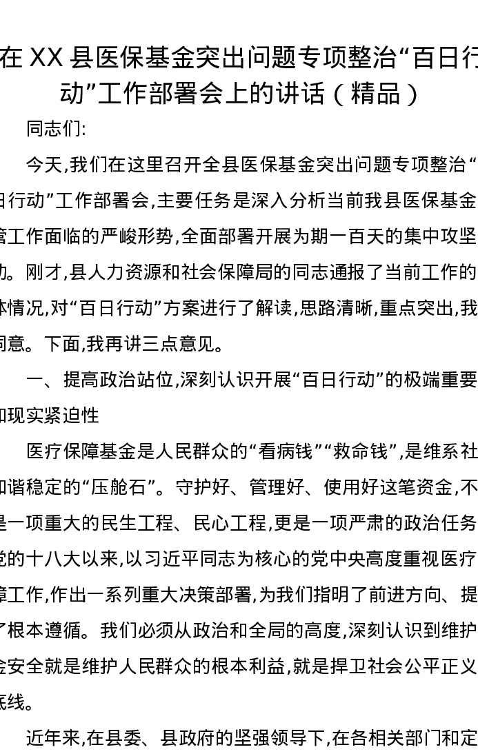 在XX县医保基金突出问题专项整治“百日行动”工作部署会上的讲话(精品)