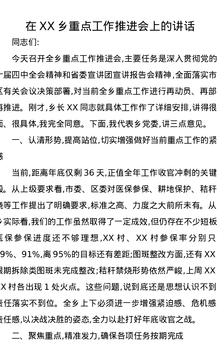 在XX乡重点工作推进会上的讲话