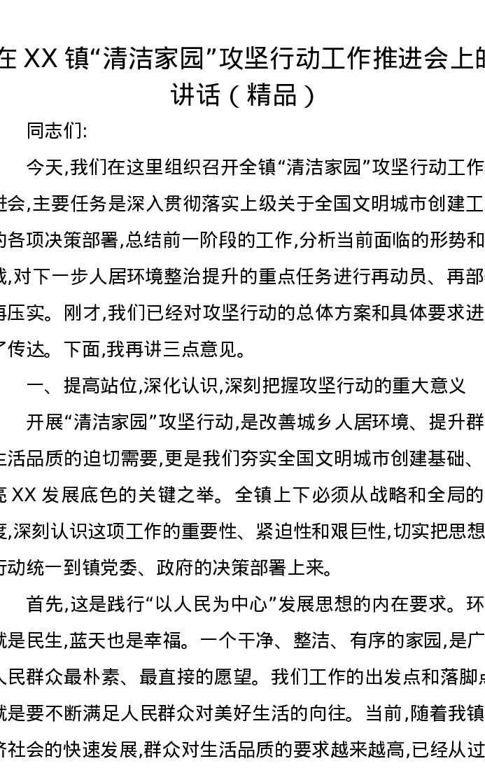 在XX镇“清洁家园”攻坚行动工作推进会上的讲话(精品)