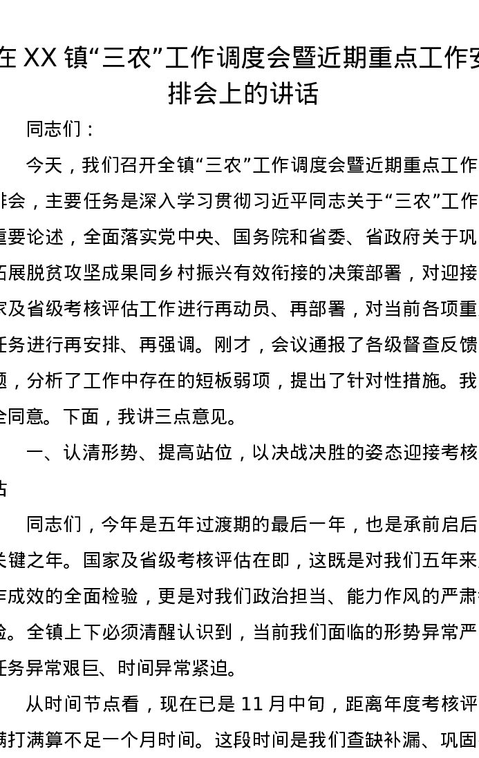 在XX镇“三农”工作调度会暨近期重点工作安排会上的讲话