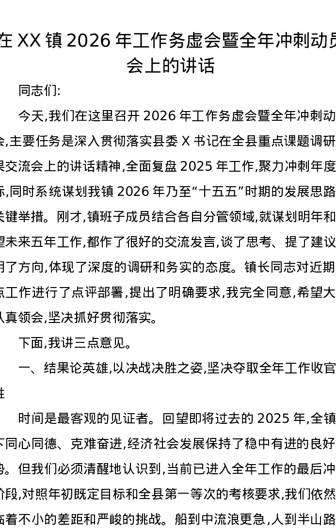 在XX镇2026年工作务虚会暨全年冲刺动员会上的讲话