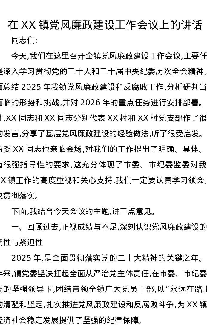 在XX镇党风廉政建设工作会议上的讲话