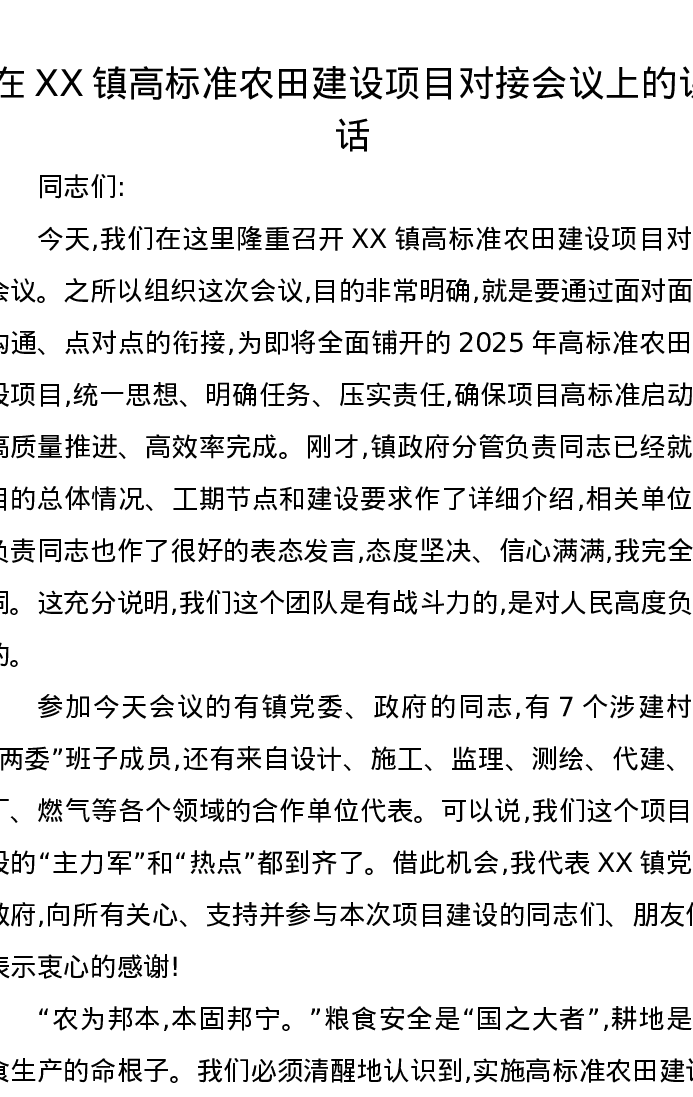 在XX镇高标准农田建设项目对接会议上的讲话