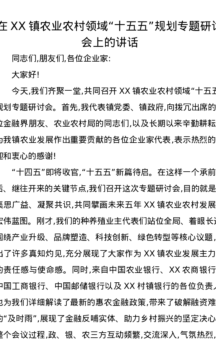 在XX镇农业农村领域“十五五”规划专题研讨会上的讲话