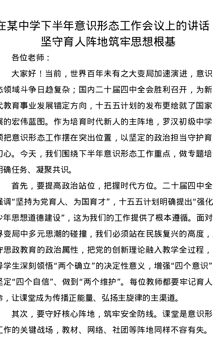 在某中学下半年意识形态工作会议上的讲话:坚守育人阵地 筑牢思想根基