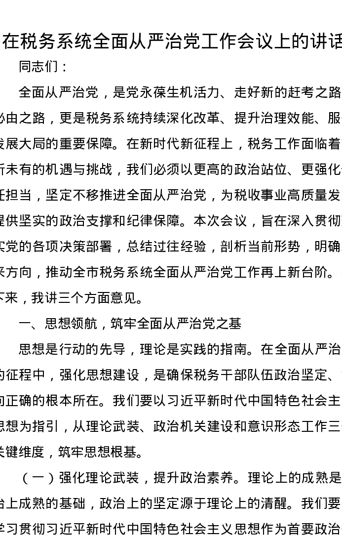 在税务系统全面从严治党工作会议上的讲话