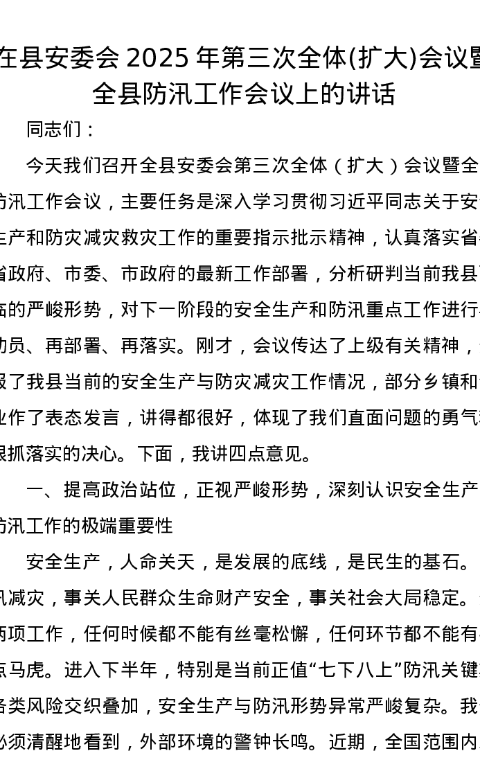 在县安委会2025年第三次全体(扩大)会议暨全县防汛工作会议上的讲话