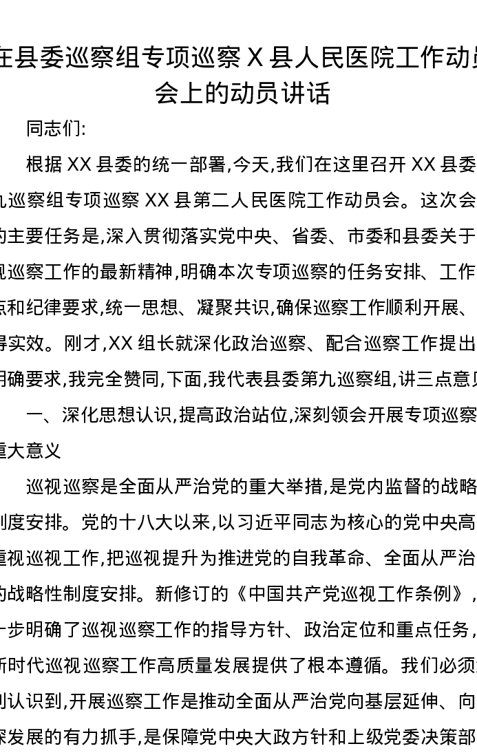 在县委巡察组专项巡察X县人民医院工作动员会上的动员讲话