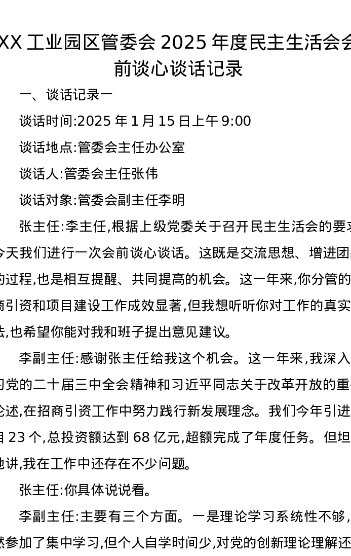 XX工业园区管委会2025年度xxxxx会前谈心谈话记录
