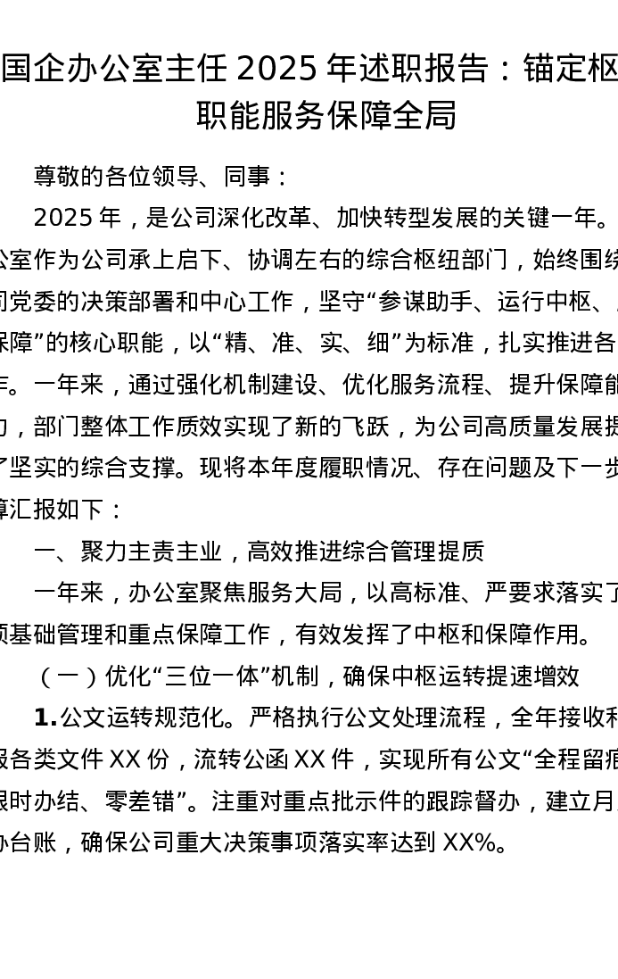 国企办公室主任2025年述职报告:锚定枢纽职能 服务保障全局