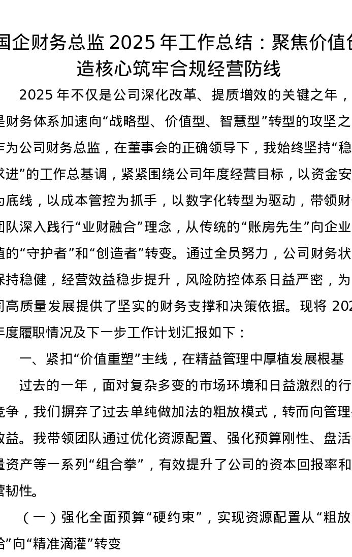 国企财务总监2025年工作总结:聚焦价值创造核心 筑牢合规经营防线