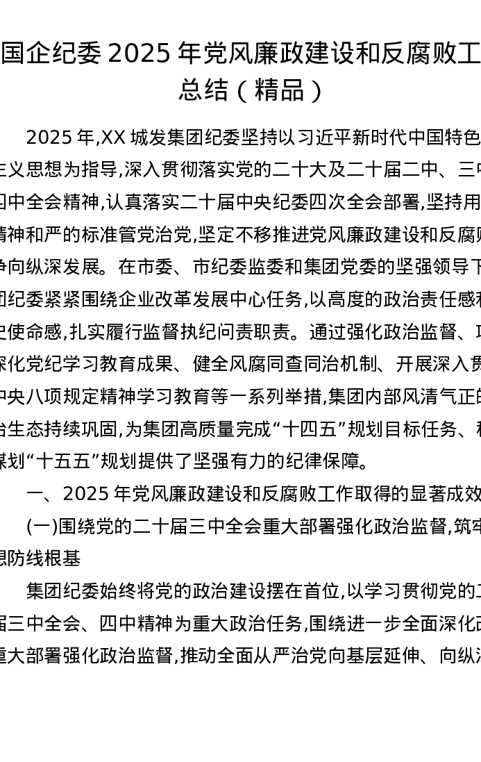 国企纪委2025年党风廉政建设和反腐败工作总结