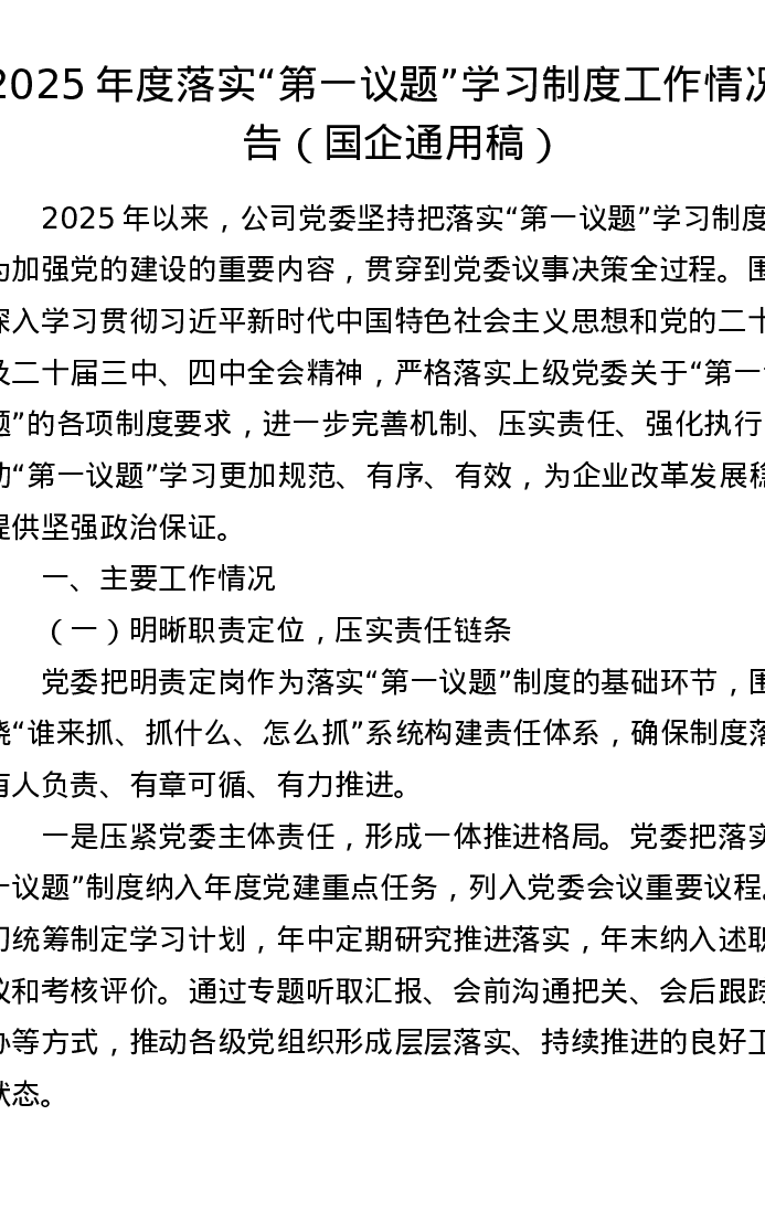 2025年度落实“第一议题”学习制度工作情况报告(国企通用稿)