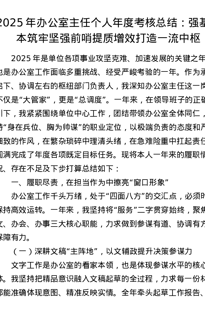 2025年办公室主任个人年度考核总结:强基固本筑牢坚强前哨 提质增效打造一流中枢