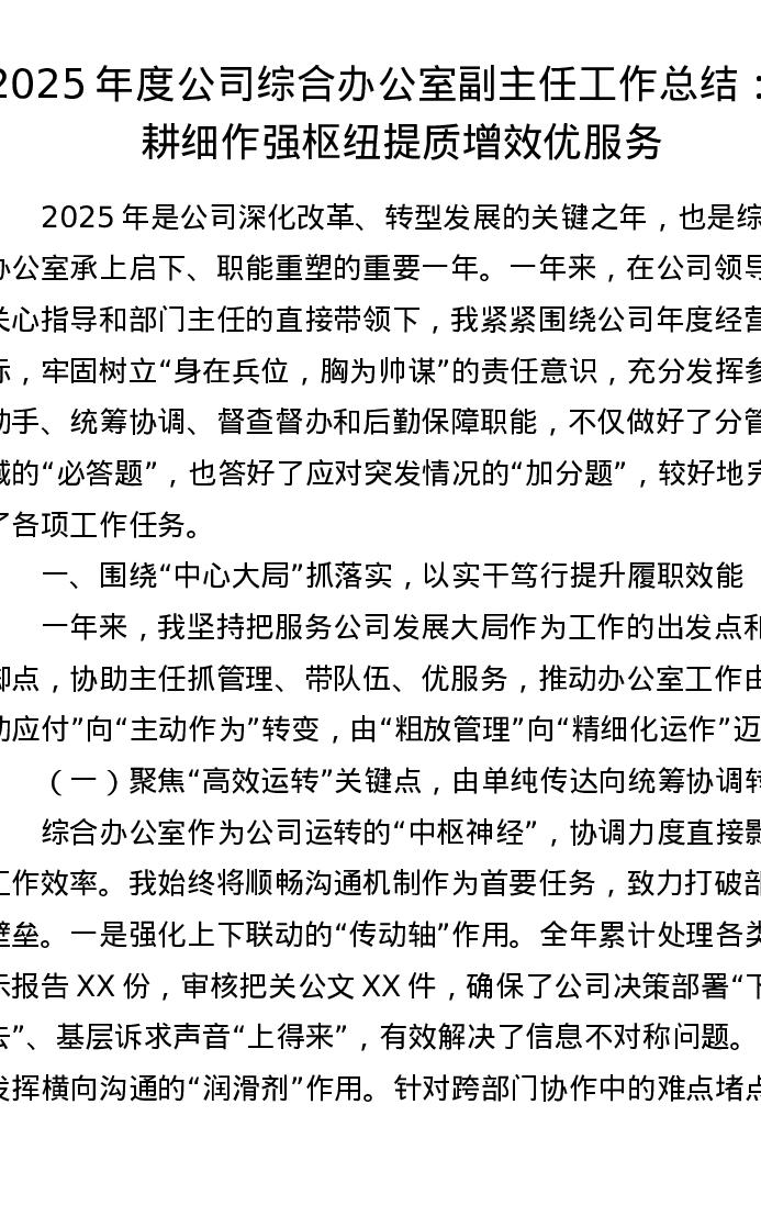 2025年度公司综合办公室副主任工作总结:深耕细作强枢纽 提质增效优服务