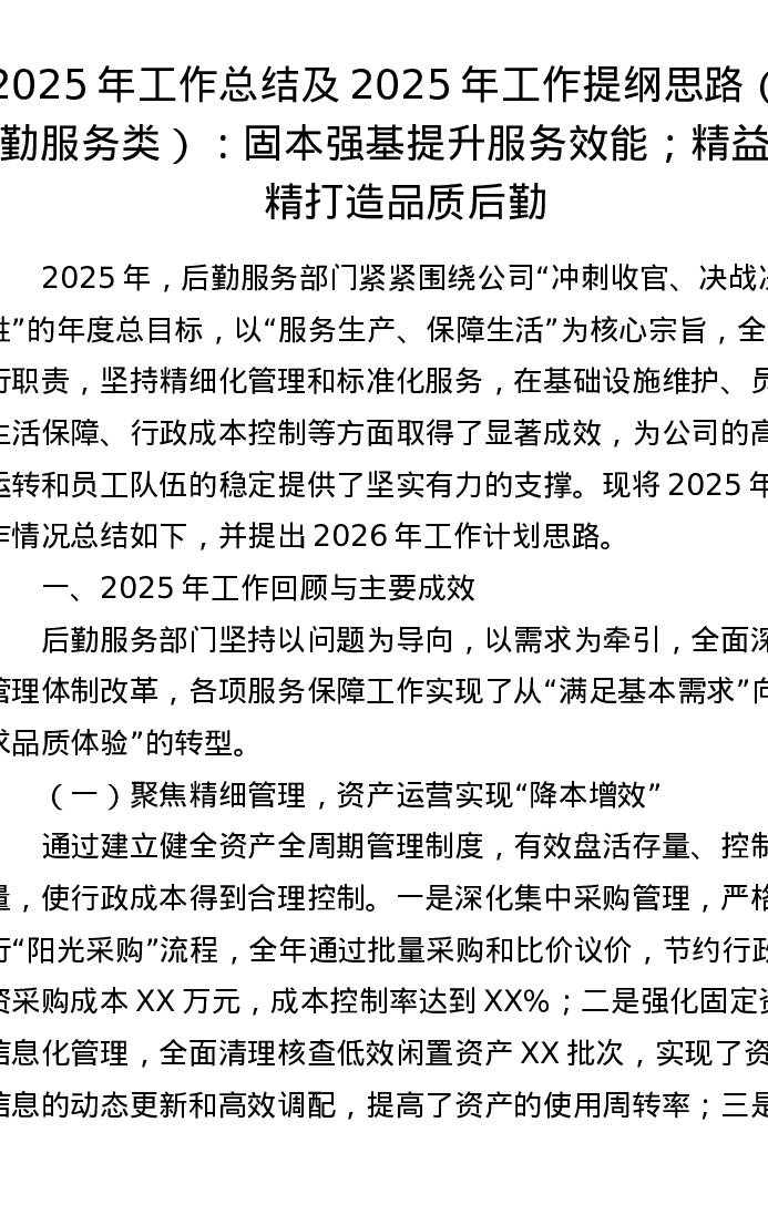 2025年工作总结及2025年工作提纲思路(后勤服务类):固本强基 提升服务效能;精益求精 打造品质后勤