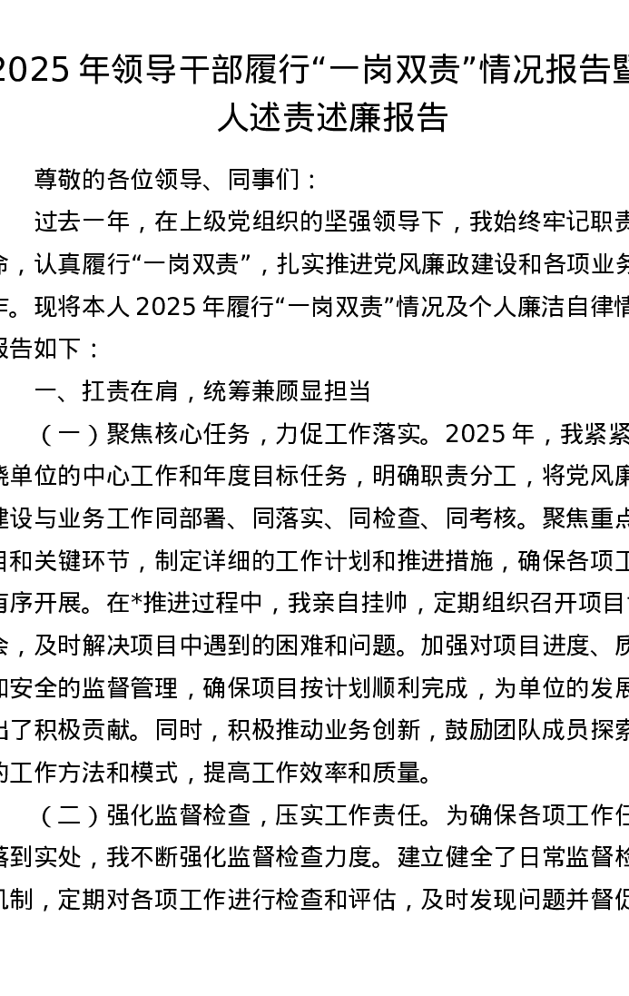 2025年领导干部履行“一岗双责”情况报告暨个人述责述廉报告(3029字)