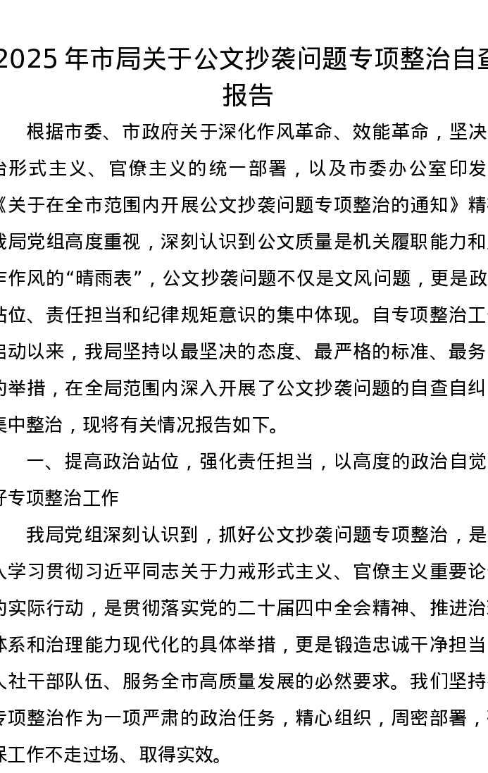 2025年市局关于公文抄袭问题专项整治自查报告